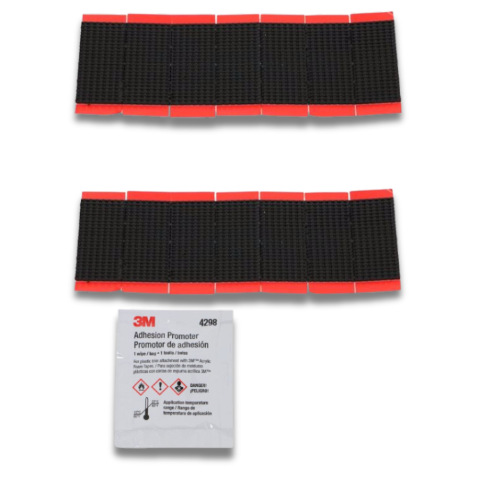 - Kit Contents: (14) 1" x 2" hook-and-loop fasteners, and a single adhesive promoter packet